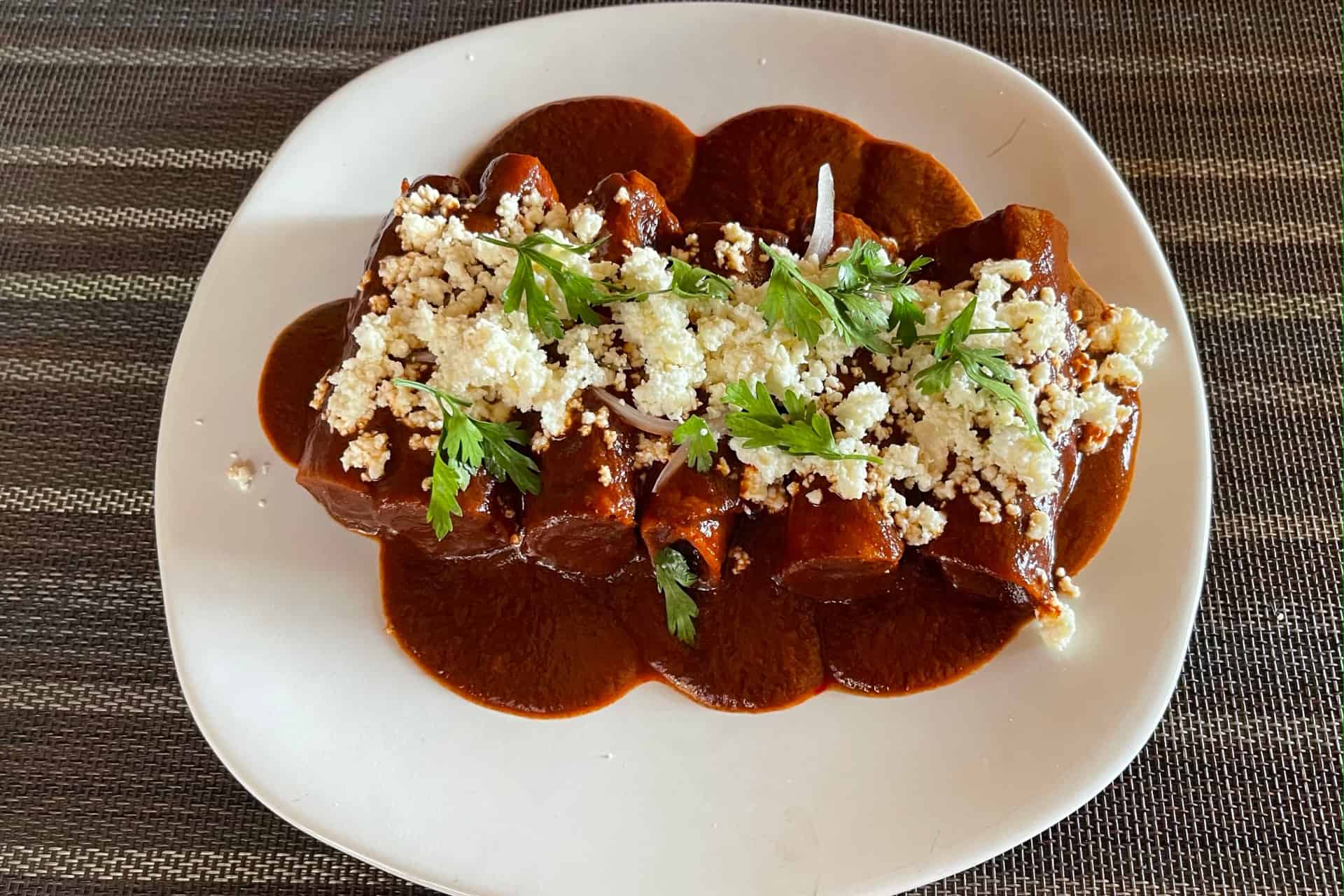 Platillo tradicional de Tlacolula de Matamoros. Tacos dorados con una mezcla de pollo y especias que hacen única la mezcla para rellenarlos. Este platillo es realizado minuciosamente al estilo tradicional Tlacolulence, todos sus ingredientes son asados y tostados, y así se pone este platillo para su degustación.